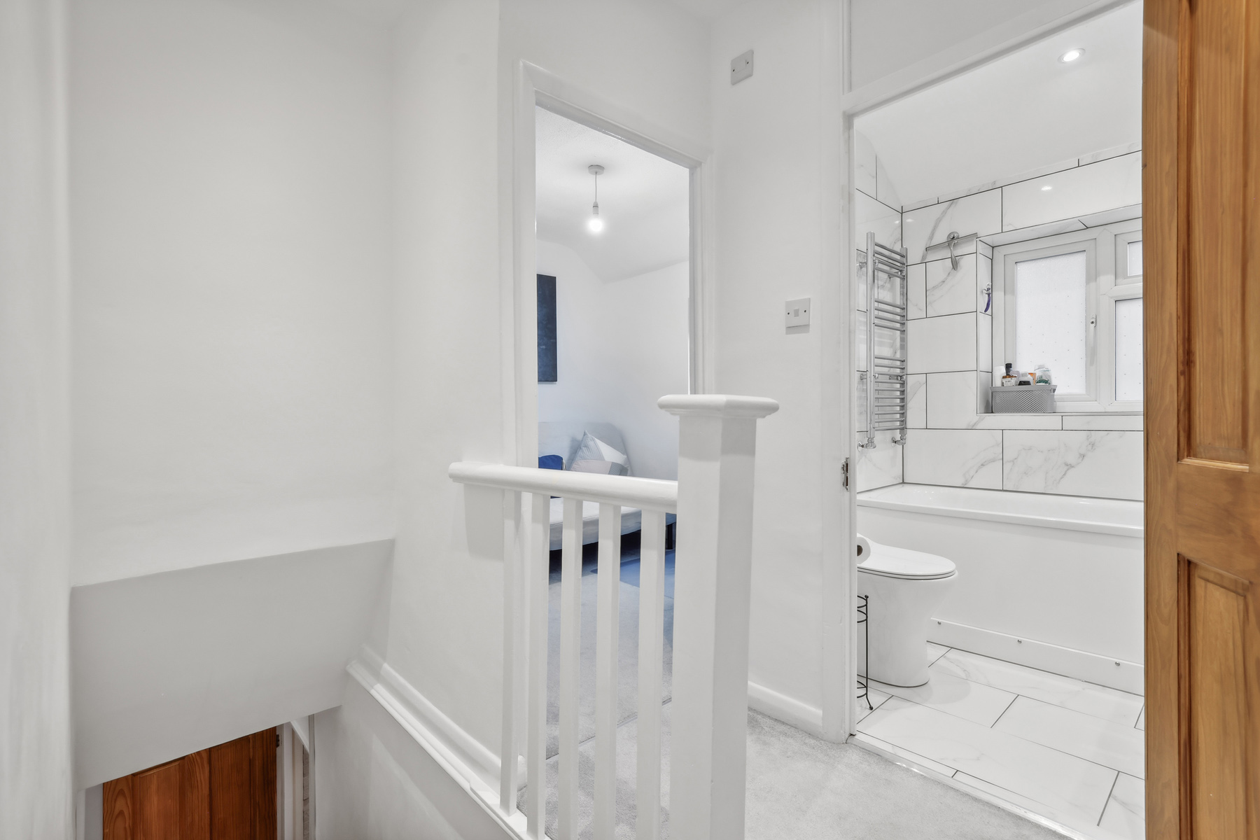 Leading up the stairs to the first floor there are two bedrooms, with built in storage space and a modern white family bathroom. The house further benefits from double glazing, gas central heating throughout and off-street parking with electric car charging point.